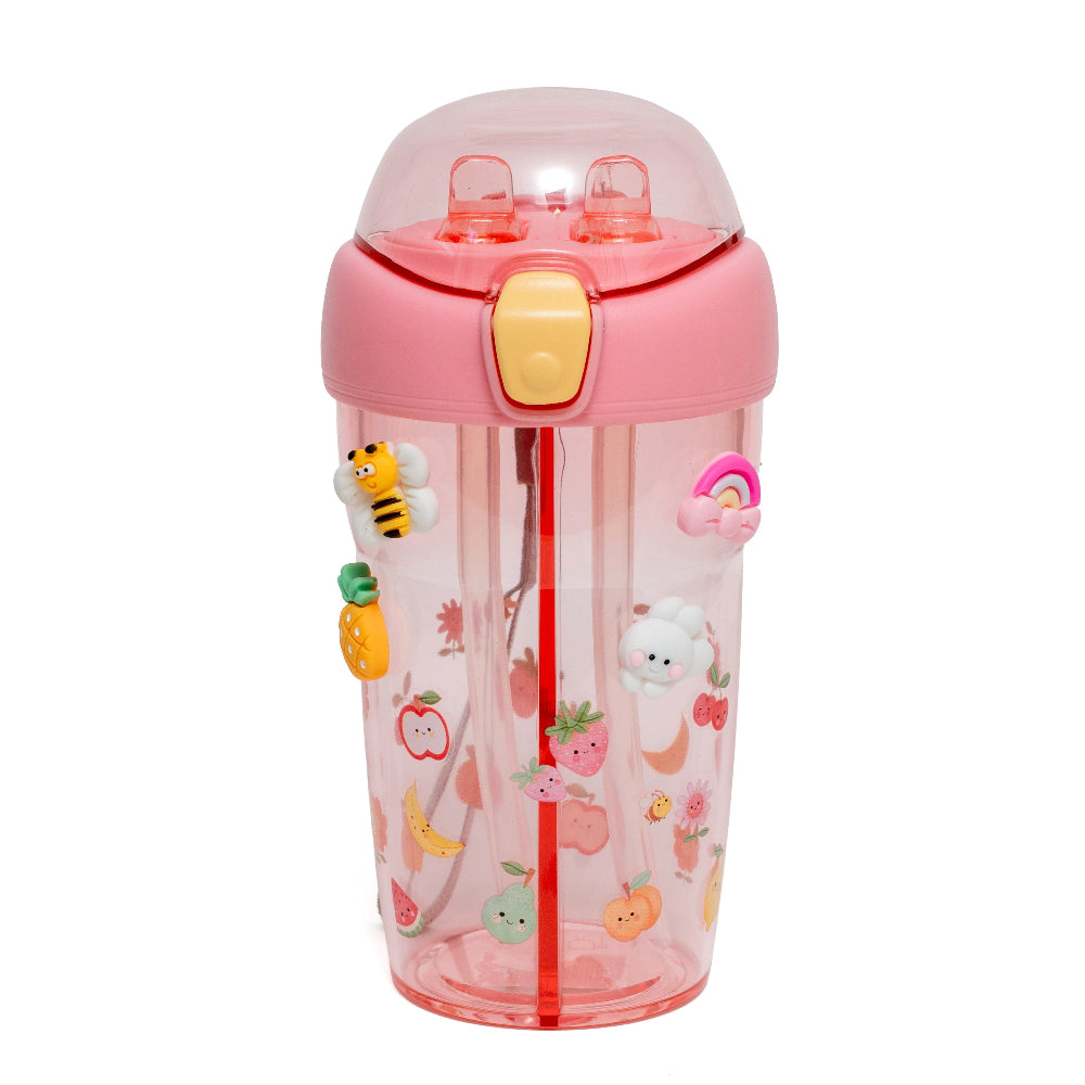 Petit Monkey 2 in 1 drinkfles, een doorzichtige roze fles met 2 compartimenten. 2 verschillende drankjes in 1 fles! Versier je fles met de 3D stickers en geef de fles zo jouw eigen draai. Altijd 2 drankjes bij je, op school of op avontuur.