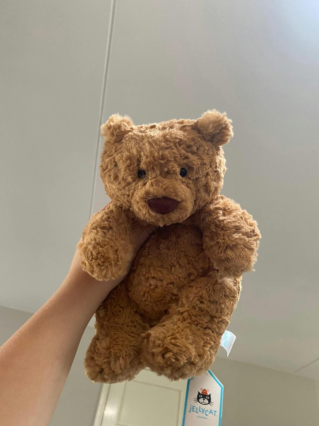 Jellycat knuffelbeer medium, Bartholomew is superzacht, de perfecte bruine knuffelbeer om lekker mee te slapen. Een grote beer van 26 cm voor de allerbeste berenknuffels, superzacht en superschattig. Deze knuffel is een mooie kinderkamer accessoire, het zitgedeelte is verzwaard, de beer blijft zitten waar je hem neerzet.