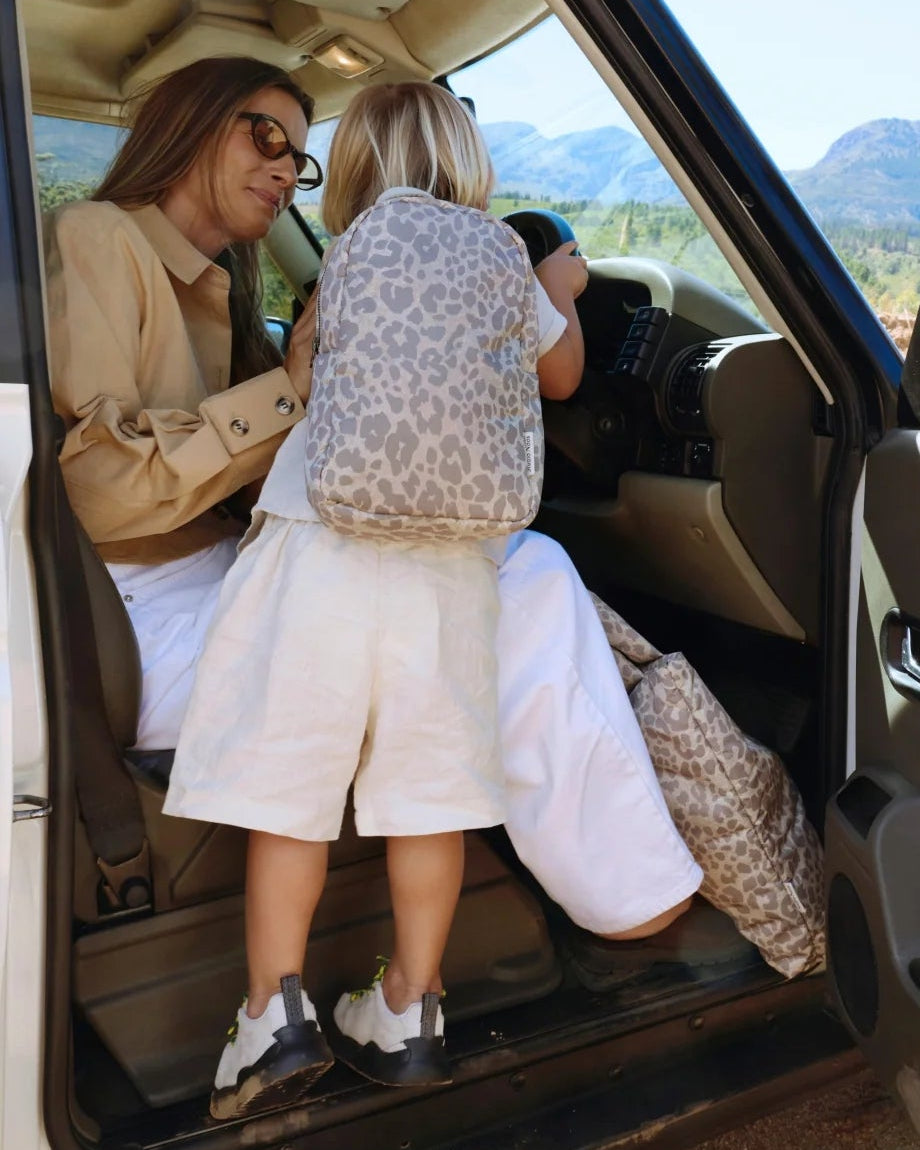 Studio Noos puffy mini backpack. In deze beige kinderrugzak met een warm grijze luipaardprint neem je al je spullen makkelijk mee naar school. De trendy lichtgewicht rugzak maakt de outfit van je kindje helemaal af!