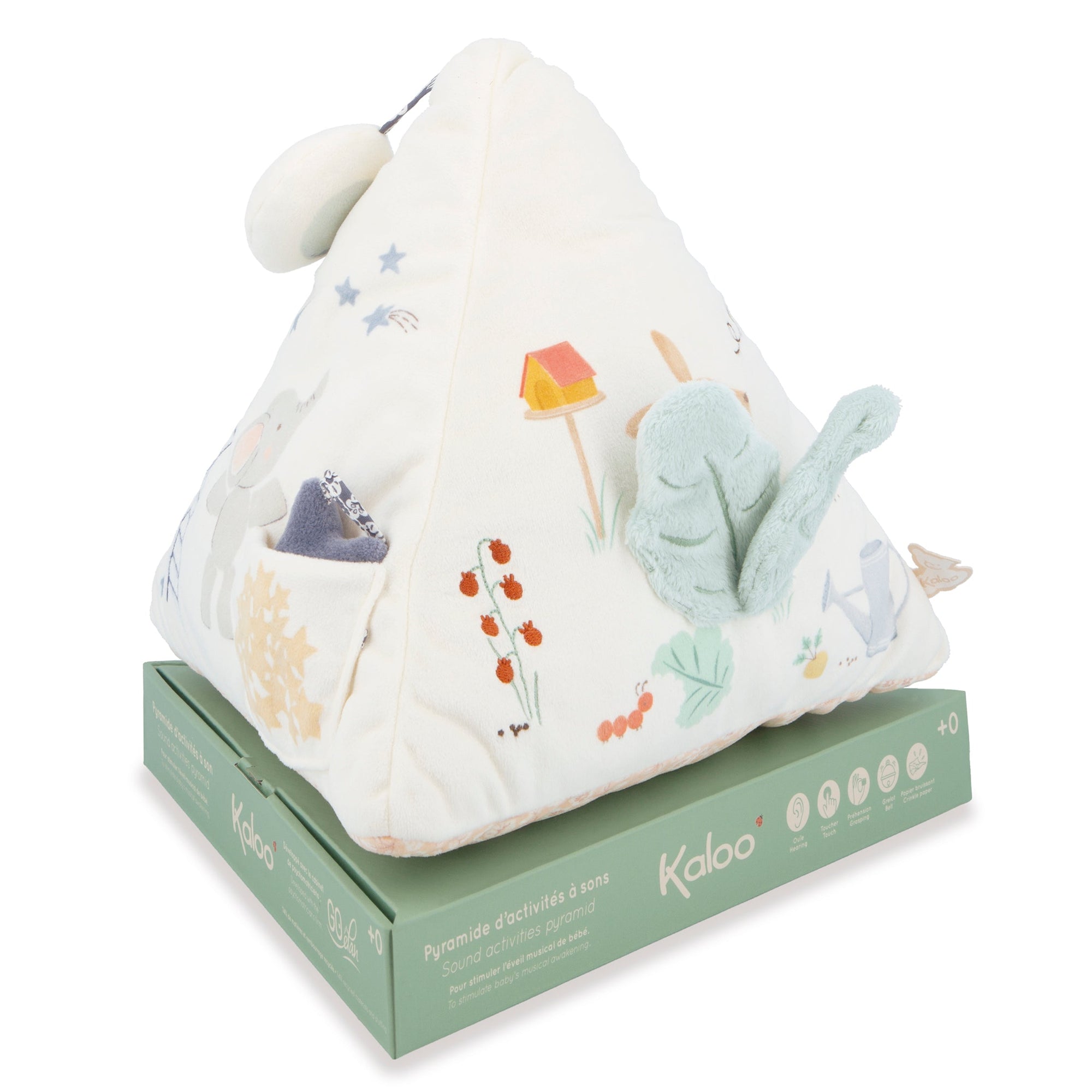 Een stoffen activiteiten piramide van Kaloo vol met geluidjes en activiteiten voor je baby. Knisperend papier, een rinkelend belletje, afbeeldingen van bekende kinderliedjes. Het konijntje heeft zich verstopt achter de kool en de kikker zit lekker op de vijver. Een piramide om de aandacht van je kindje te trekken.