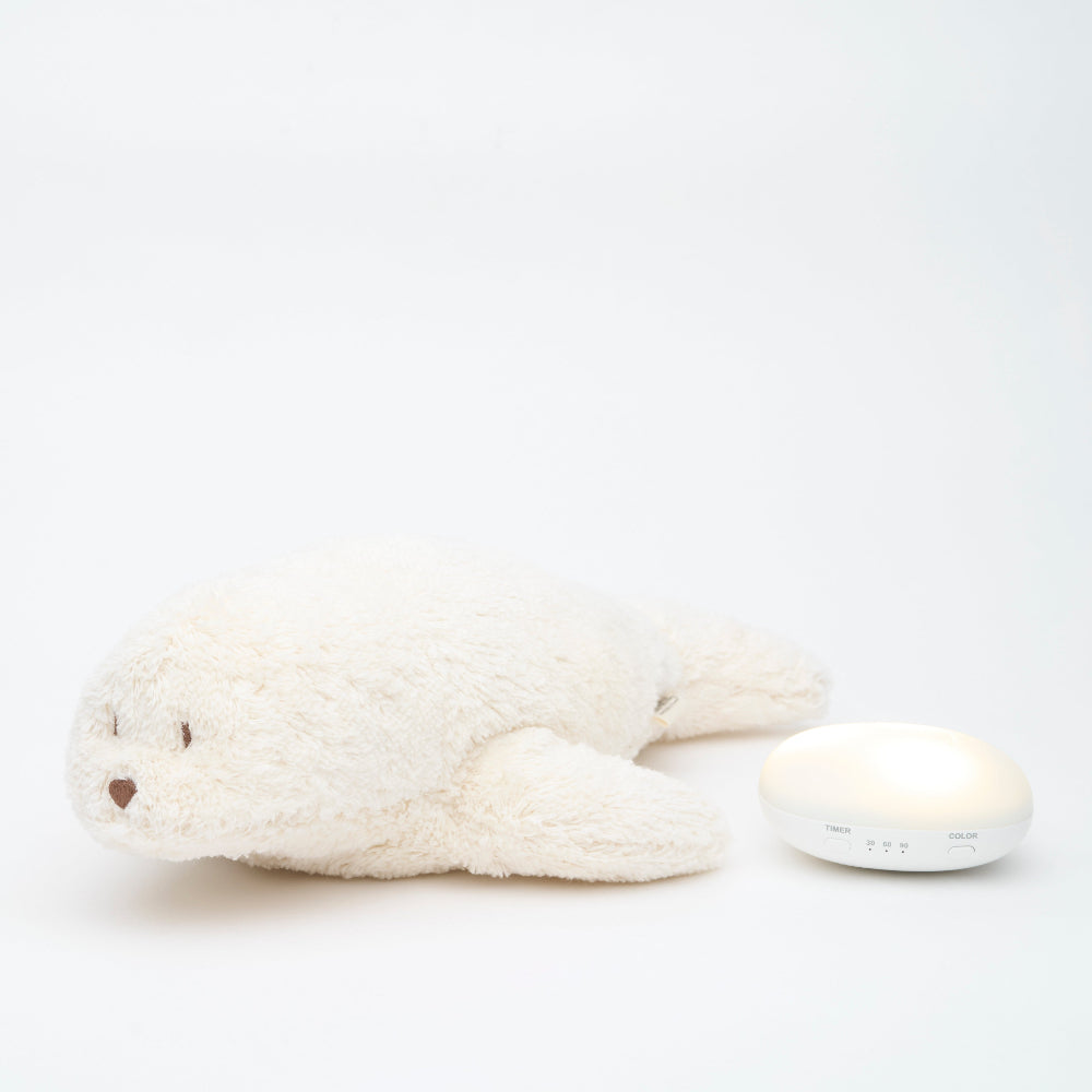 Moonie zeehond knuffel wit met geluiden én nachtlamp, een zachte teddy knuffel zeehond die je baby helpt om rustig in slaap te vallen.