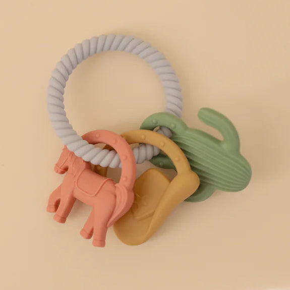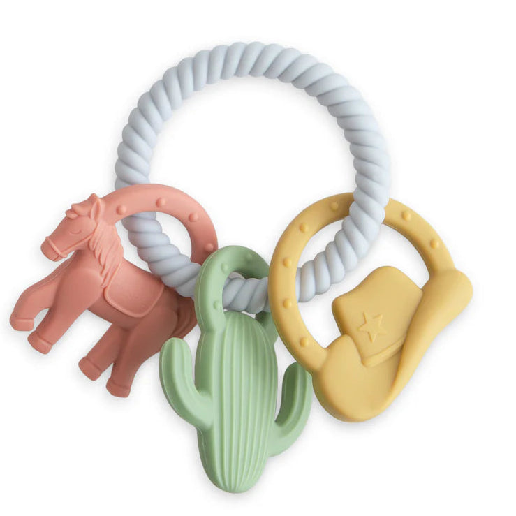 Mushie bijtring western een silicone bijtspeeltje voor je kleintje met 3 westernelementen: een paard, cactus en cowboyhoed. Dit siliconen is bijtspeelgoed is geschikt om te gebruiken vanaf 3 maanden en ook bij het doorkomen van de eerste tandjes, rond 6 maanden.