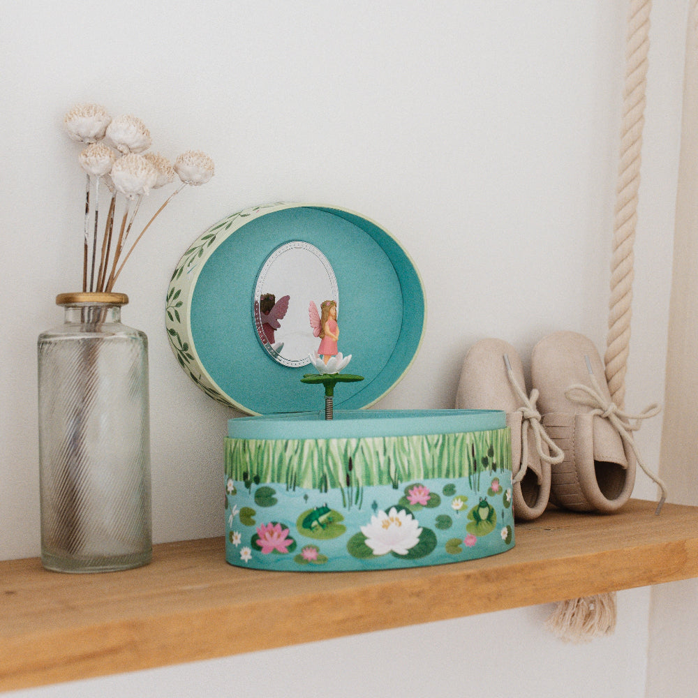 On the outside of the oval bijoux box you can see the fairy on her swing in a lake full of lilies and frogs, illustrated by Rebecca Jones. Open the lid and the fairy appears on a lily pad.