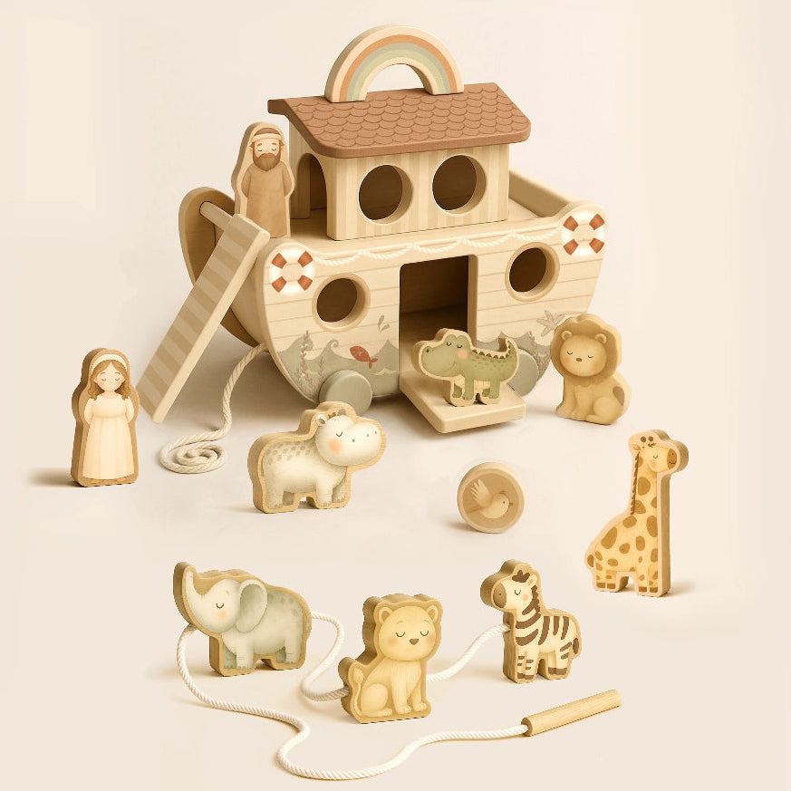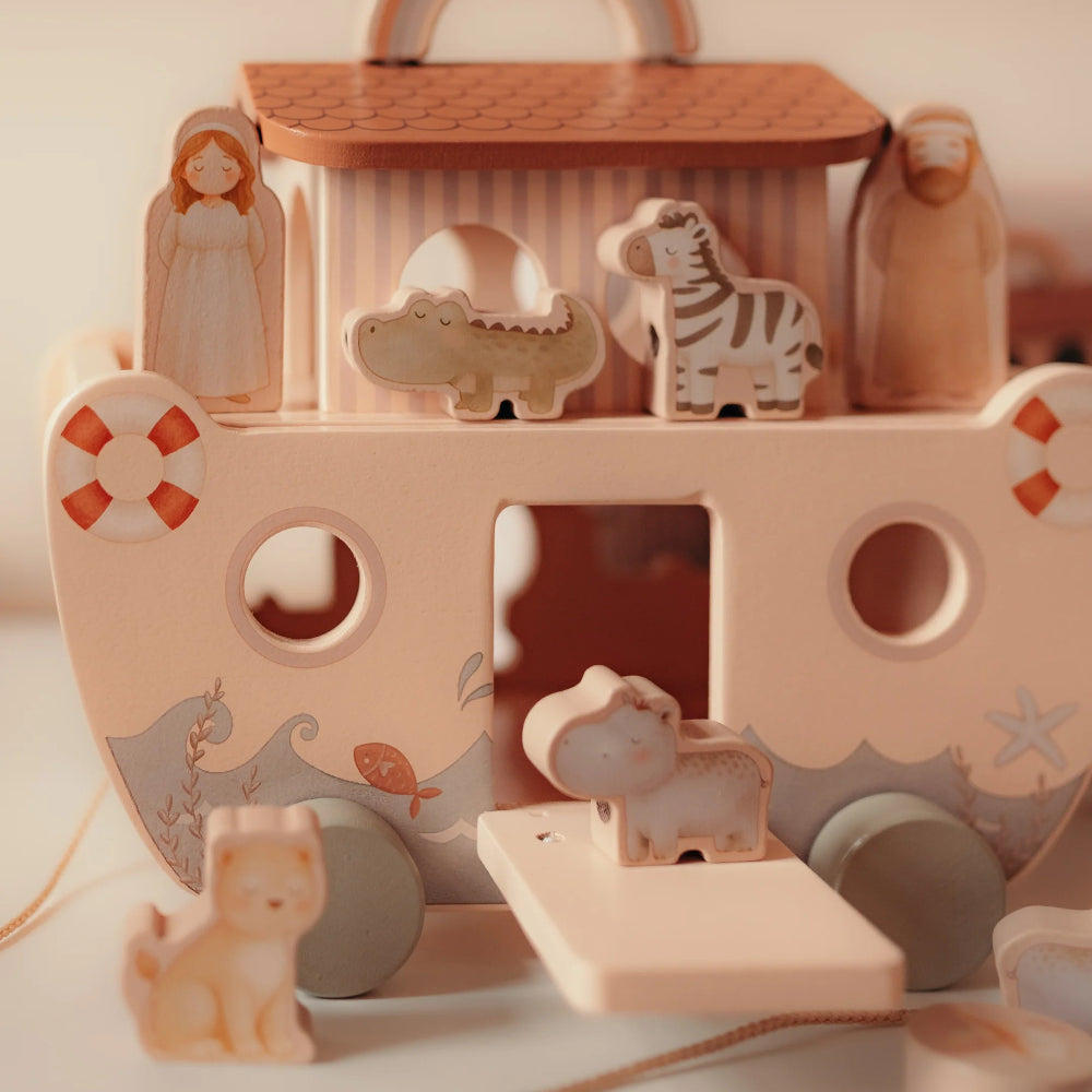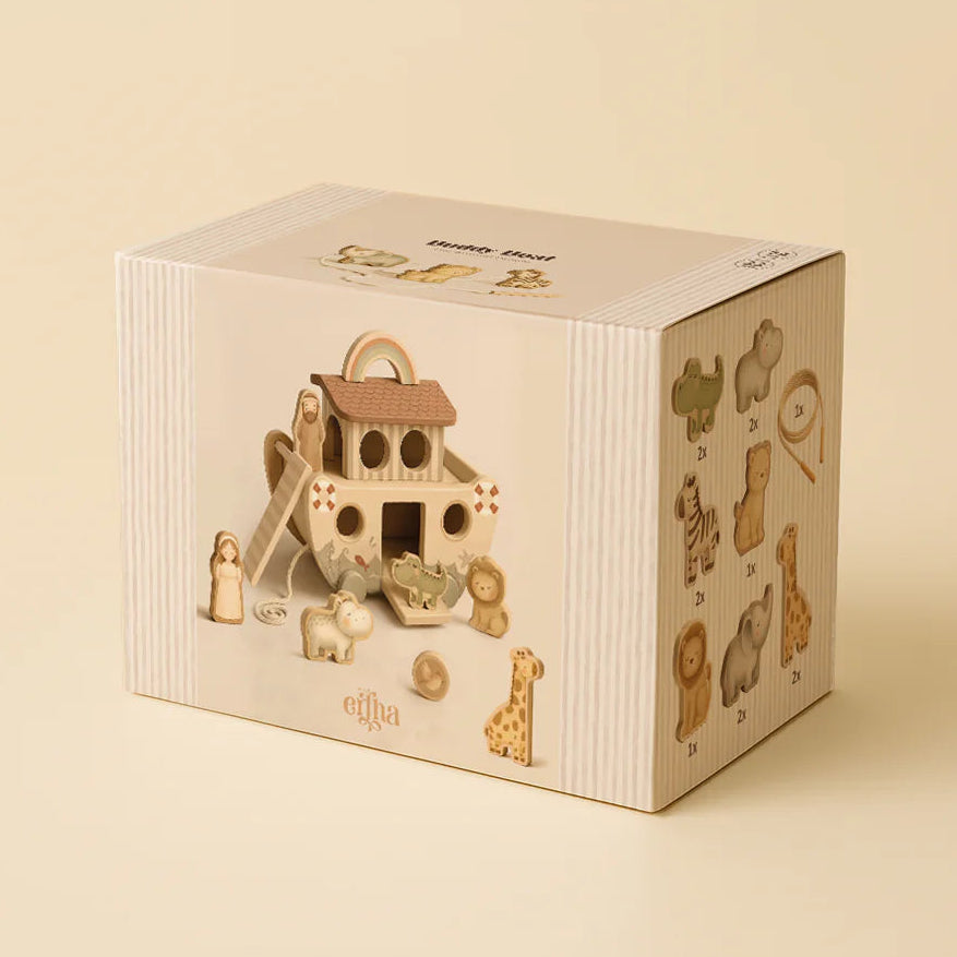 Mrs Ertha Ark van Noach is een houten speelgoedboot op wieltjes. De 22-delige set bestaat uit onder andere 14 dierenfiguren, Noach, zijn vrouw en een koord met houten uiteinde om de dieren doorheen te rijgen. Perfect Montessori speelgoed voor kinderen vanaf 2 jaar, waarmee ze spelenderwijs hun fijne motoriek, visuele waarneming en logisch denken ontwikkelen.