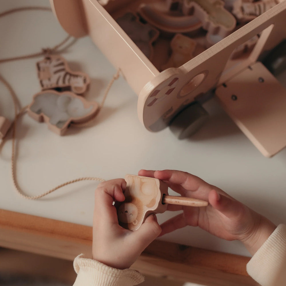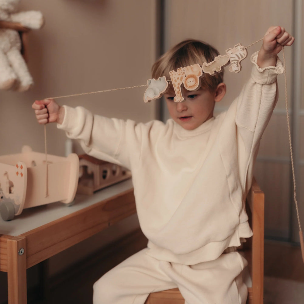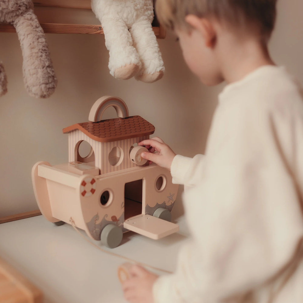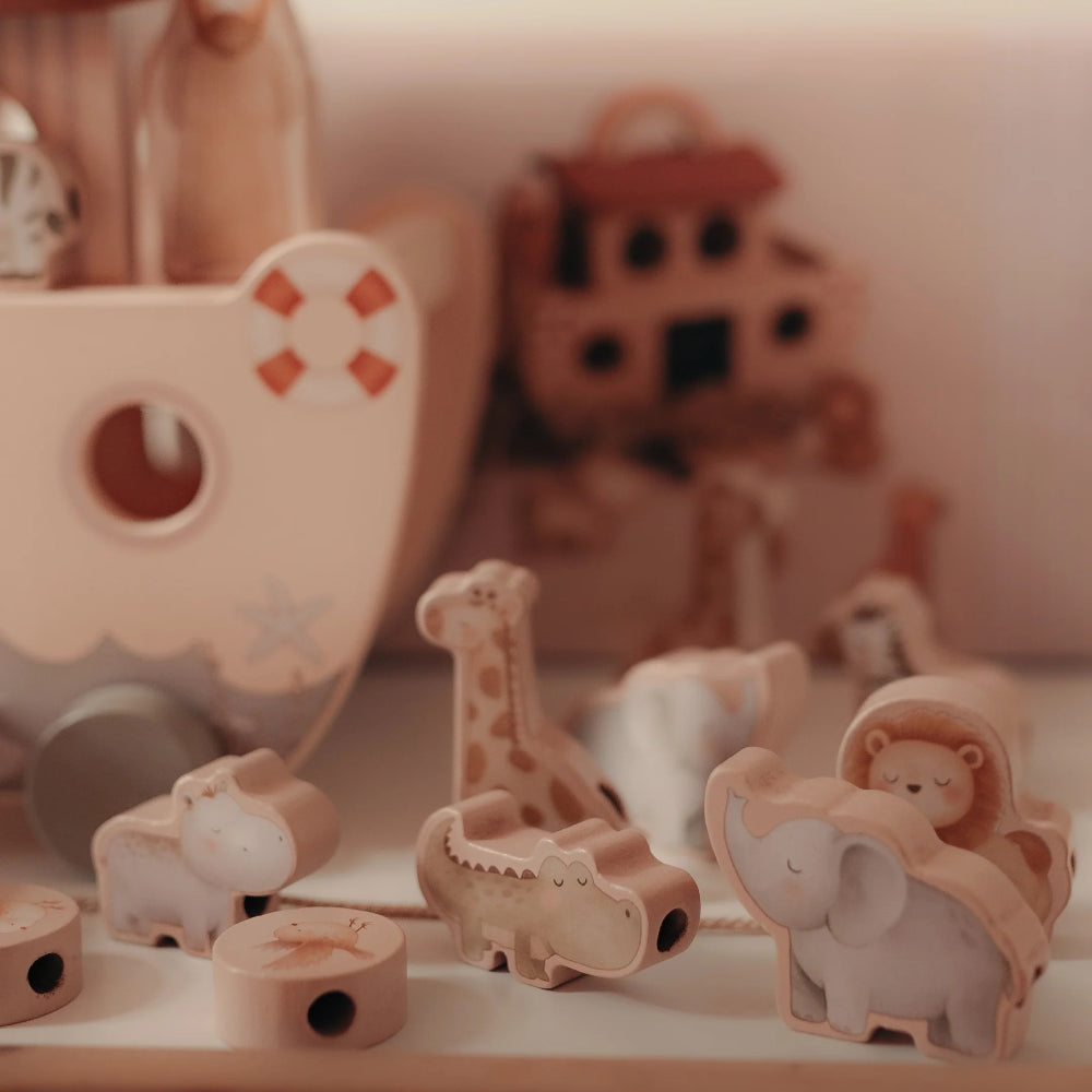 Kinderen kunnen de dieren op de boot plaatsen, ze rijgen met het koord of laat ze avonturen bedenken met de regenboog en ladder. Dit houten bootspel biedt eindeloze mogelijkheden voor spelen, leren en fantasierijke avonturen. Zowel samen als met andere kinderen.