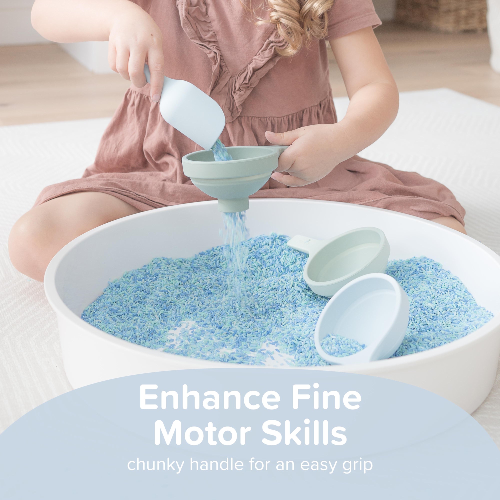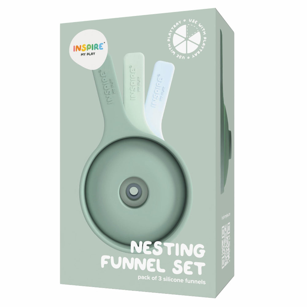3 Inspire my Play trechters, gebruik de groene en blauwe trechters tijdens het spelen met waterkralen, kinetisch zand en speelrijst in jouw play TRAY schaal. Een mooie uitbreiding voor je sensory play, sensorisch speelgoed collectie.