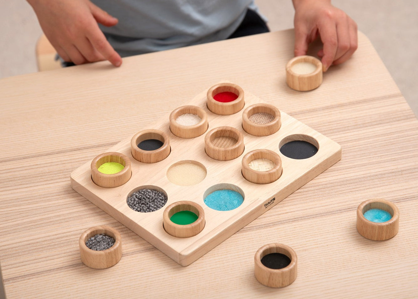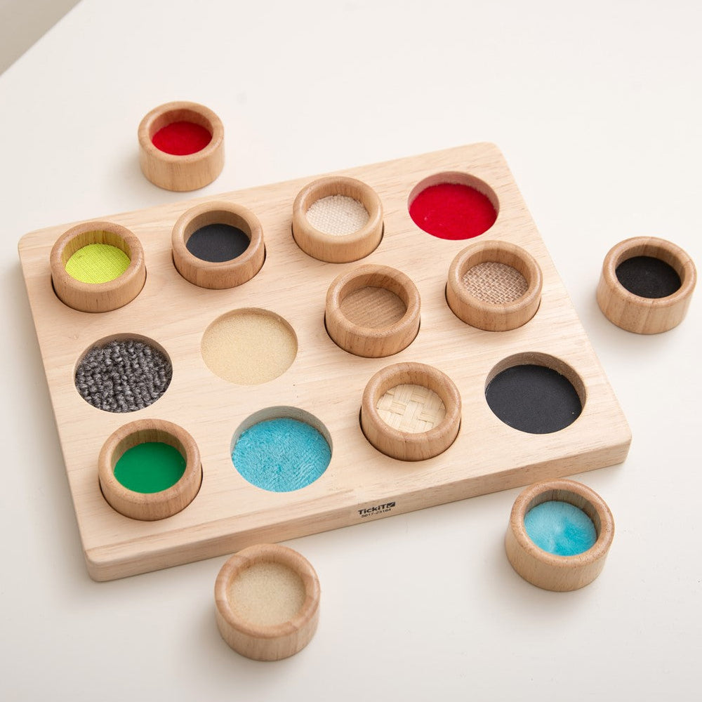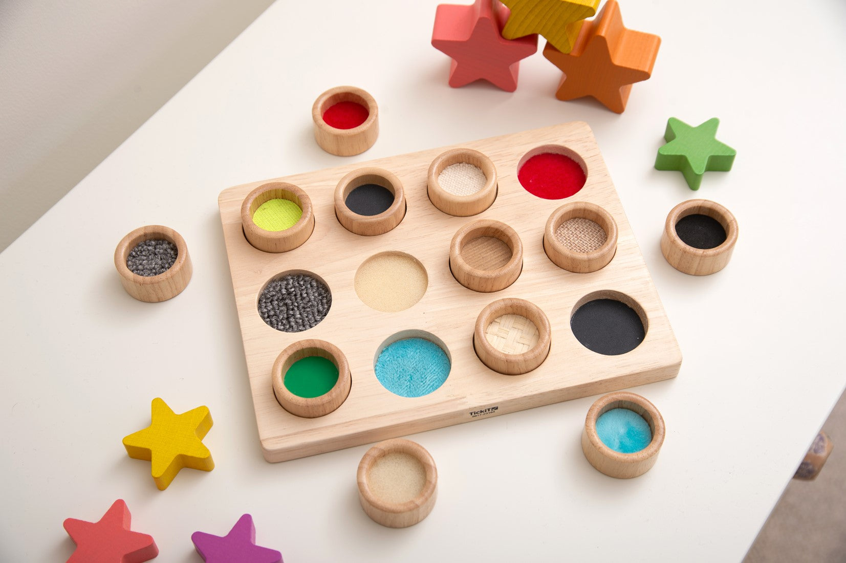 Tickit sensorisch sorteerspel is door de kleine onderdelen geschikt voor kinderen vanaf 3 jaar. Het bord bestaat uit een houten bord met texturen en 12 houten fiches met corresponderende texturen. Je kindje leert door middel van spel verschillende texturen herkennen en sorteren.