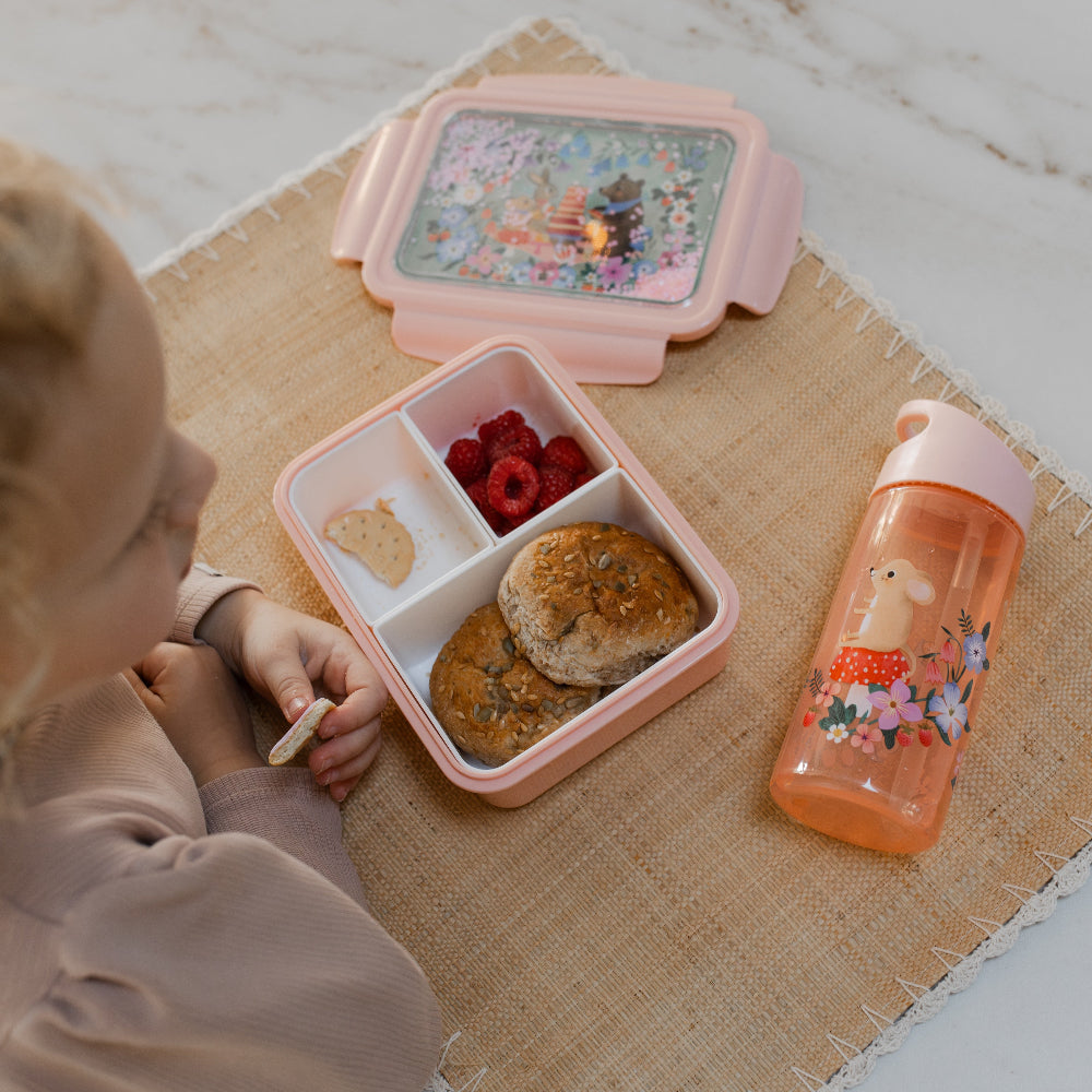Petit Monkey drinkfles animals picnic, een lekvrije drinkfles met rietje met muisjes en een taart geïllustreerd door Rebecca Jones. De fles heeft een handige drinktuit die open en dicht geklapt kan worden.