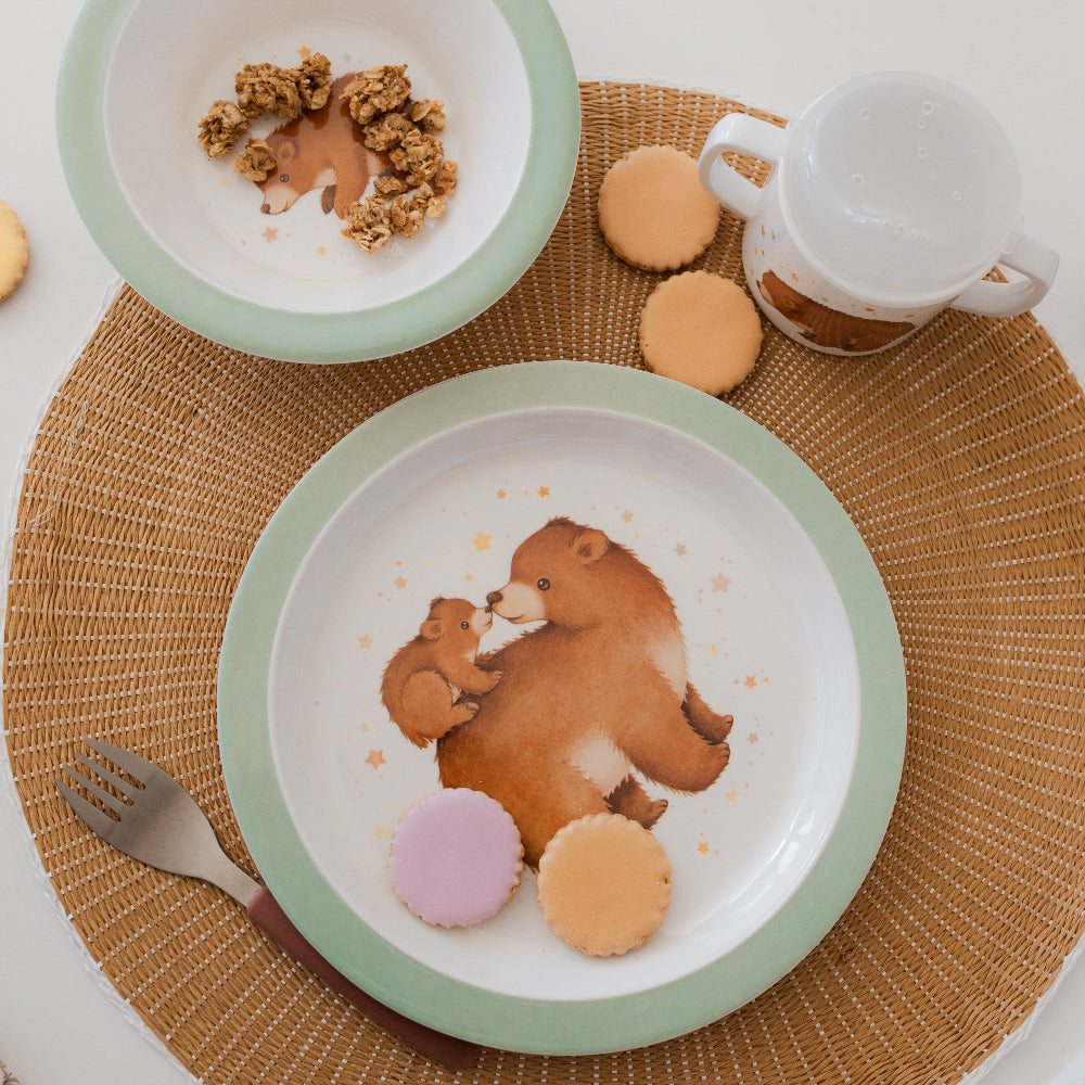 Petit Monkey kinderbord met groene rand en een mama- en babybeer en sterren. Het bord... read more