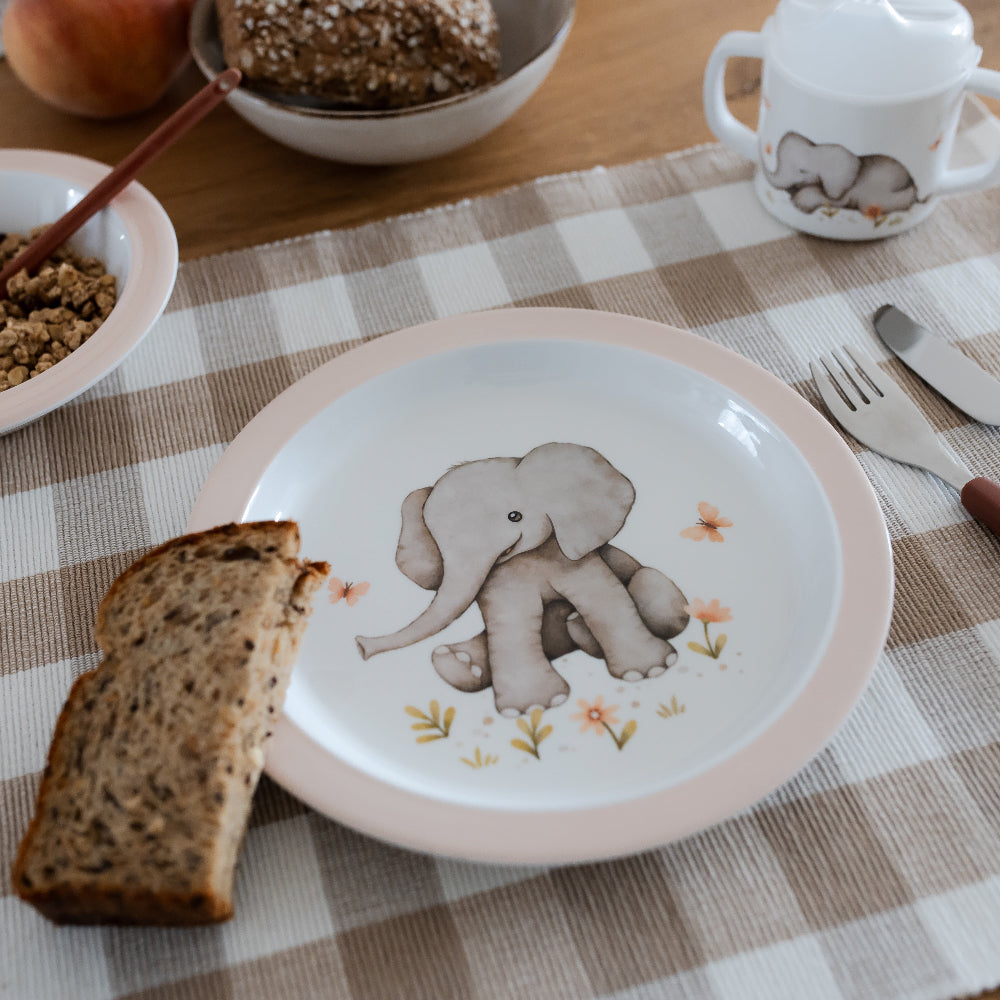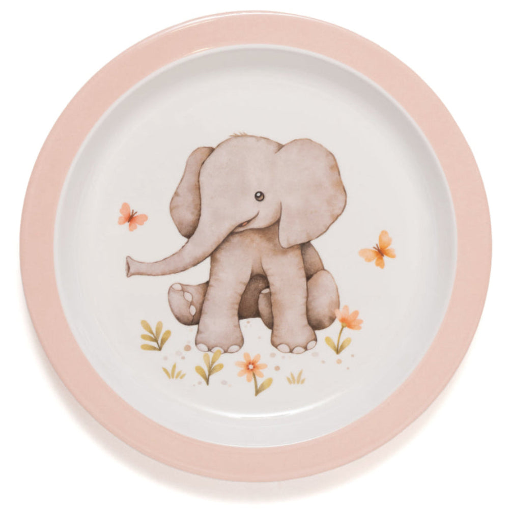 Petit Monkey kinderbord met perzik rand en een olifant. Het bord is gemaakt van 100%... read more