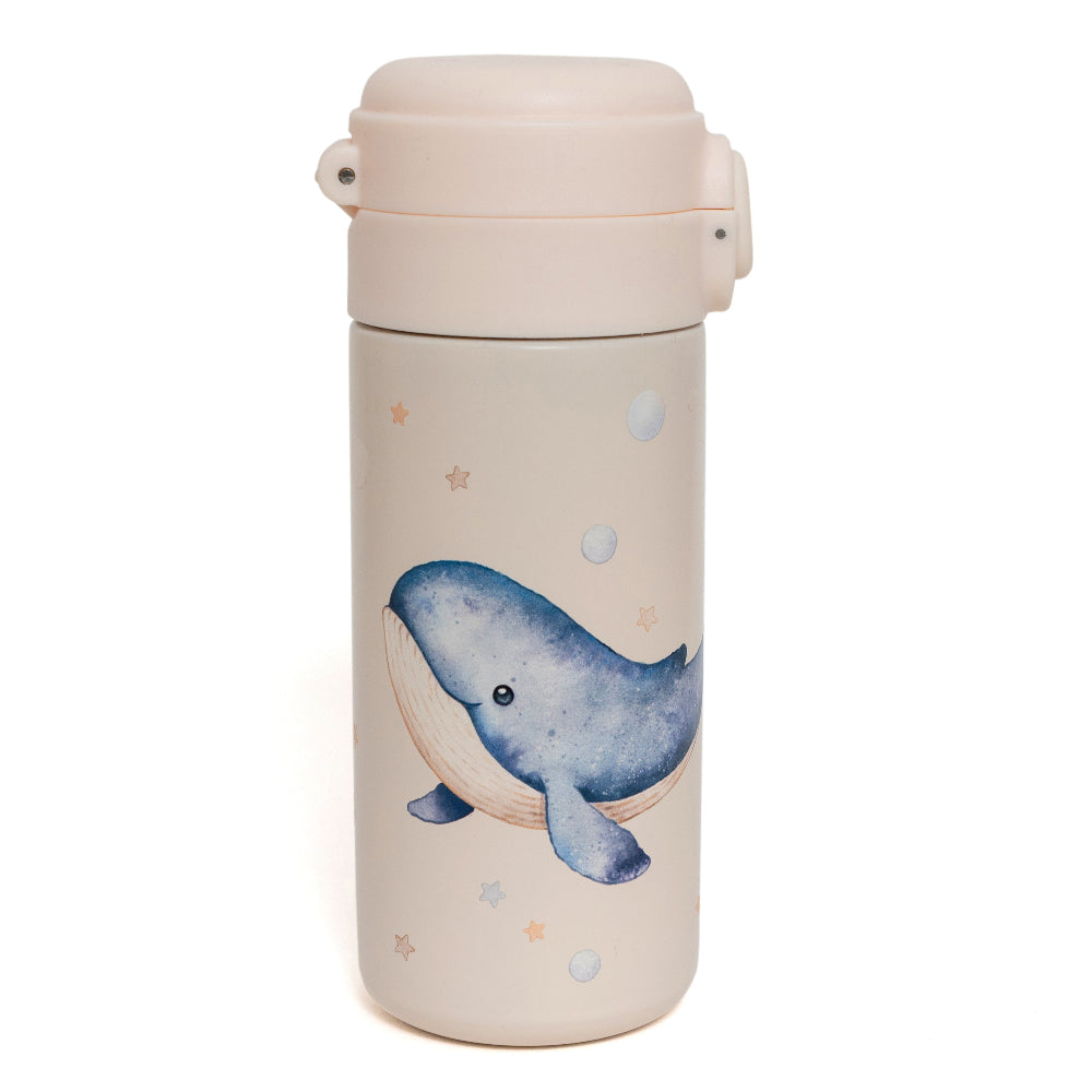 Petit Monkey stainless steel drinkfles met een mooie walvis erop. Met de knop voorop is de fles makkelijk te openen om te kunnen drinken en vervolgens kun je de fles ook weer goed afsluiten met de deksel. De fles is geïsoleerd, waardoor drinken tot 12 uur koud blijft, ideaal dus om mee te geven naar school.