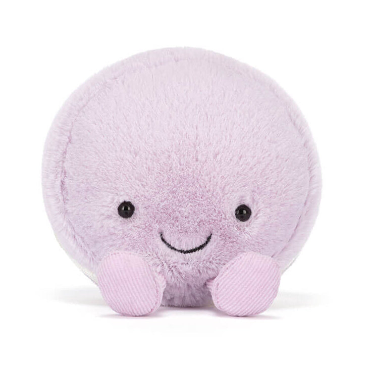 Jellycat macaron knuffel in de kleur lila. De handformaat macaron knuffel heeft de bekende amuseables oogjes, een glimlach en korte corduroy pootjes.