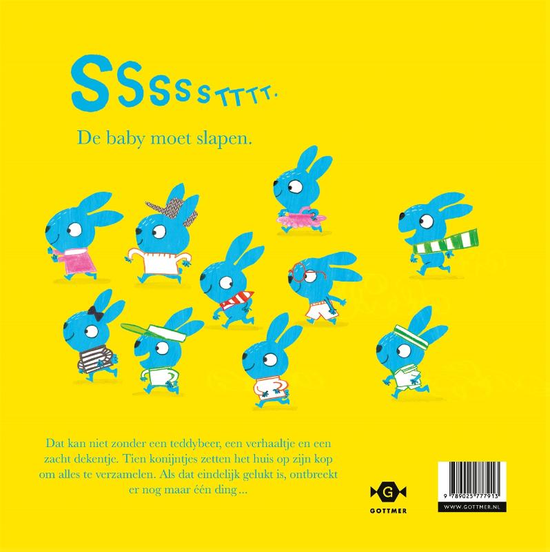 Een groep van 10 konijntjes krijgt de taak om de baby naar bed te brengen. Maar daar komt meer bij kijken dan je zou denken. De baby kan niet slapen zonder knuffel, maar waar is Beer? De konijntjes zetten het hele huis op stelten om de knuffel te vinden. Als ze die eenmaal gevonden hebben, mist er nog iets: een boekje. En een dekentje. Daar gaan we weer! Zou het de konijntjes lukken om de baby in slaap te krijgen? En wat gebeurt er als alle konijntjes willen gaan slapen?