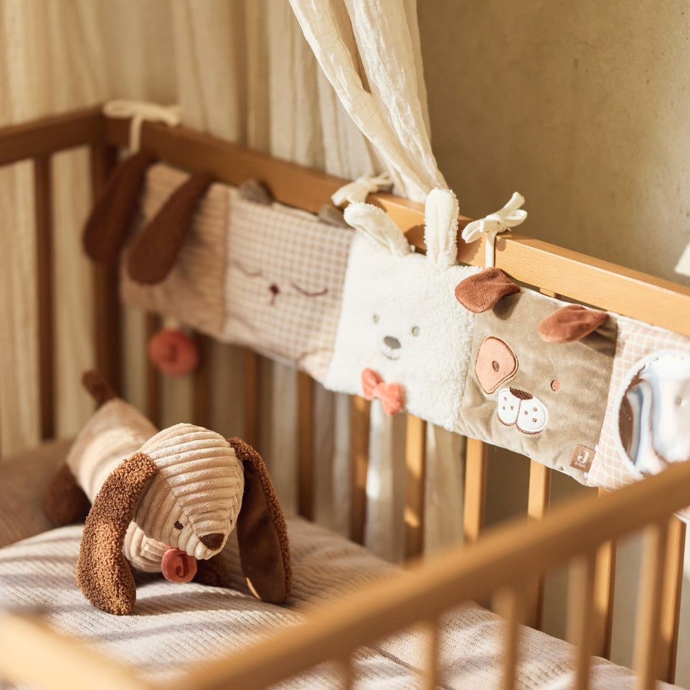 Hang Jollein activiteiten boxhanger Animal friends aan de box of het ledikant en ontdek welke nieuwe dierenvriendjes je allemaal hebt. De activiteitenhanger is uitgeklapt 82 cm breed en is gemaakt van 100% polyester. Met de 4 stiklinten bevestig je hem aan de box of het ledikant.