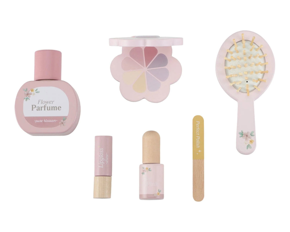 Little Dutch kaptafel flower is geschikt voor kinderen vanaf 3 jaar en wordt geleverd met een draaiende spiegel, een haarborstel, lippenstift, nagellak. parfum, vijl en een make-up pallet.