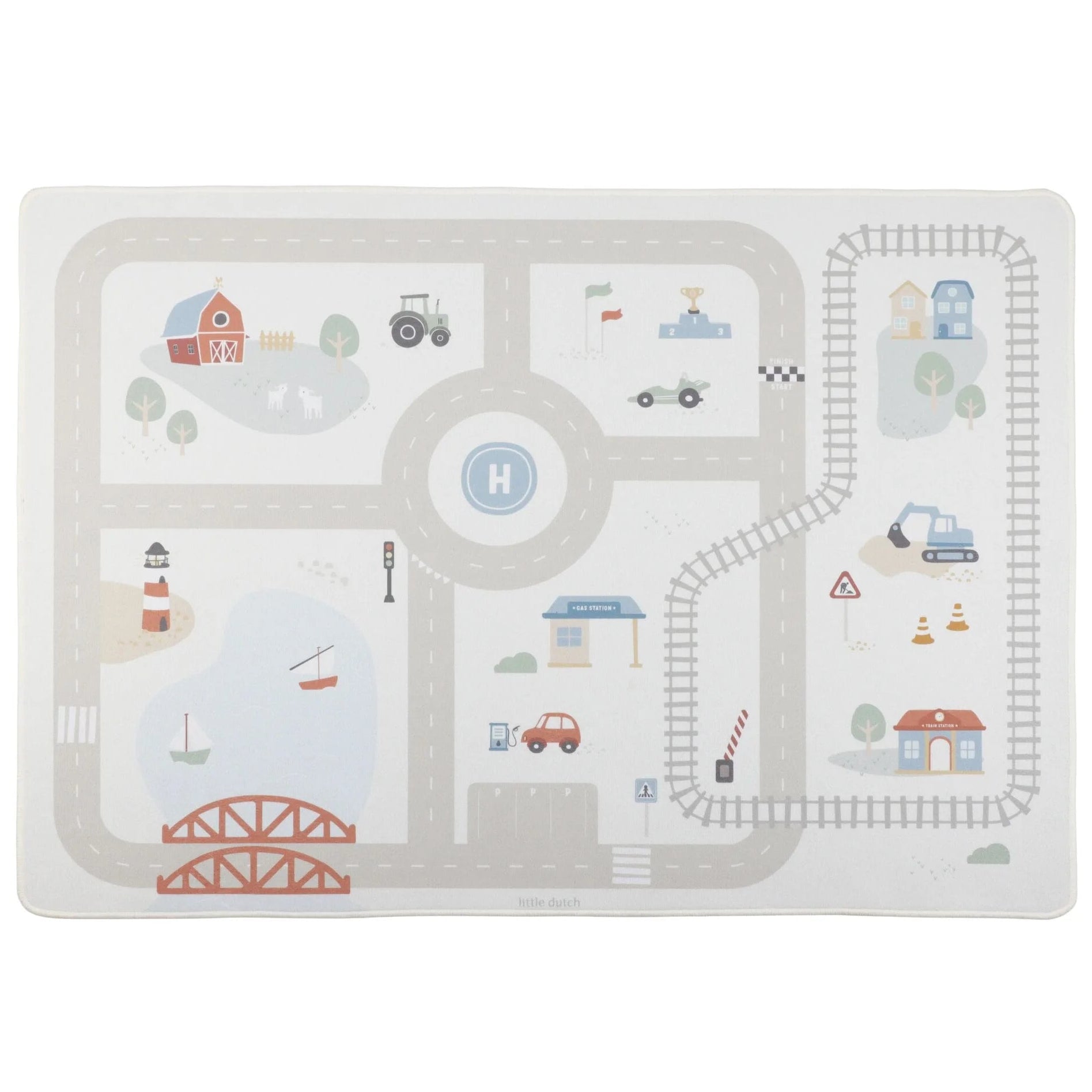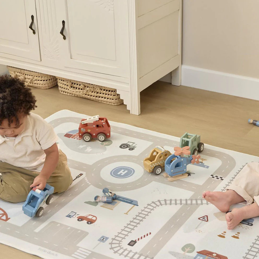 Little Dutch vloedkleed auto's speciaal ontworpen is voor de allerkleinsten. Met een vrolijke wegenprint biedt dit kleed eindeloos speelplezier, Rijdt over de brug, een rotonde en kruis een spoorweg overgang en creëer je eigen wereld.