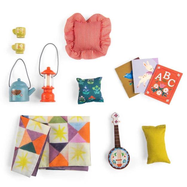 Deze set bestaat uit: banjo, deken, lantaarn, theepot, 2 houten kopjes, 3 boeken, 3 kussens. Geschikt voor de Les Minouchkas serie.