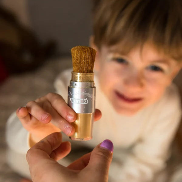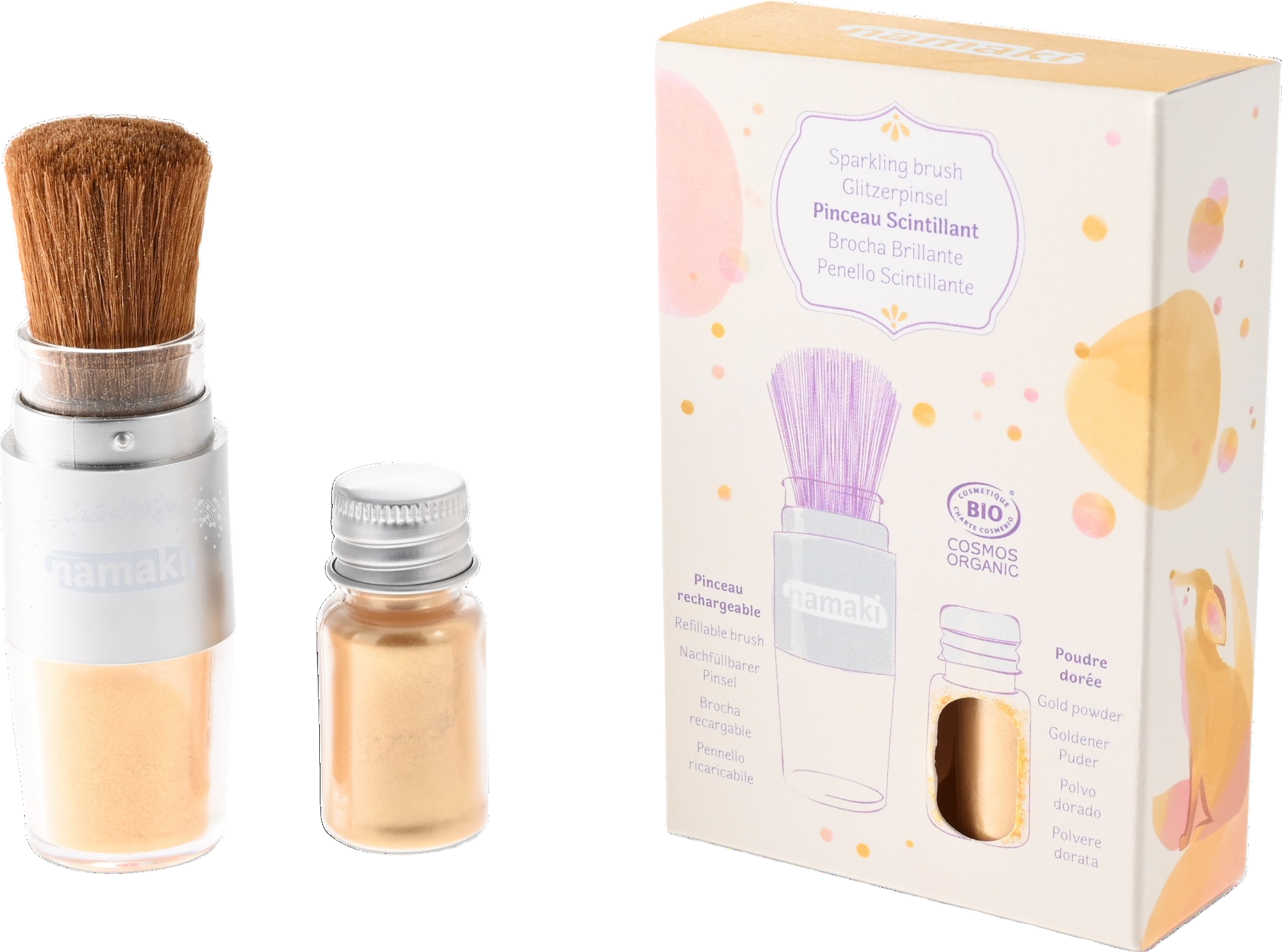 Glitterpoeder van Namaki in de kleur goud. Breng gouden glitters aan op je haar en huid met deze magic brush. De kwast is gemaakt van zacht materiaal en is zo licht als een veertje. De perfecte combinatie om je te laten stralen!