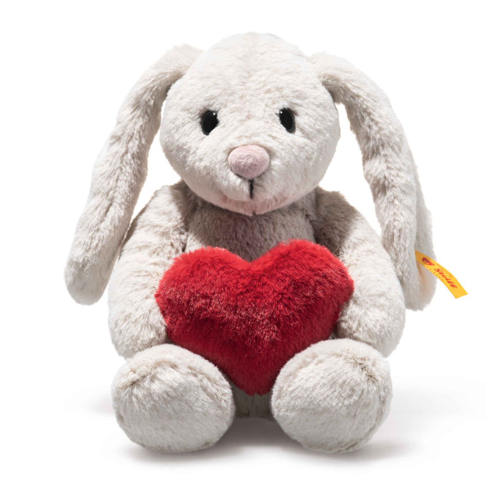 Een super zacht Steiff knuffel konijntje in een lichtgrijze kleur. Deze kleine maar fijne knuffel heeft een lief gezichtje met kraaloogjes en lange hangoren, en is daarmee een fijn vriendinnetje voor ieder kind. Hoppie Love heeft een rood hart vast, helemaal klaar om met jou te knuffelen.