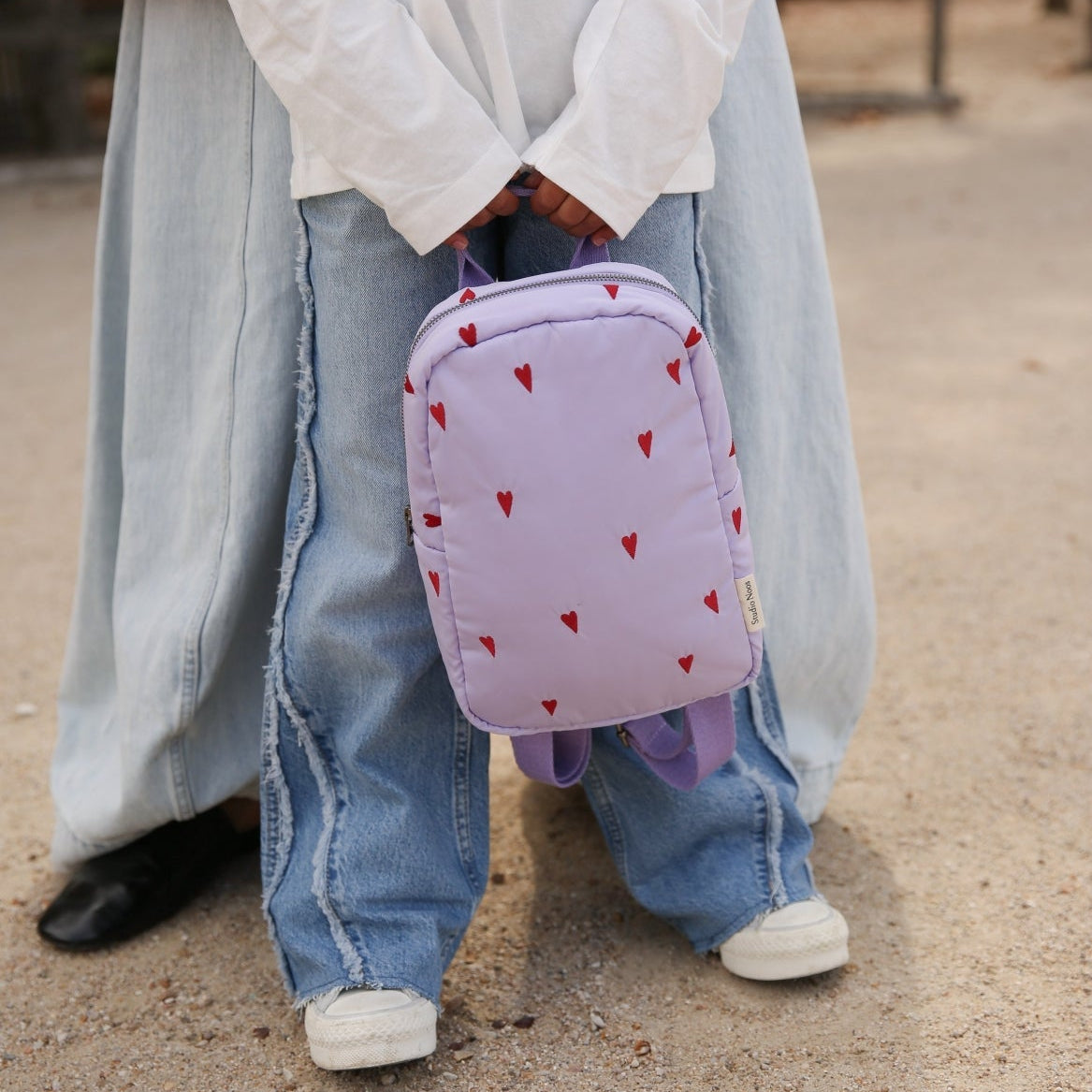 Studio Noos puffy mini backpack purple hearts, in deze lila kinderrugzak met rode geborduurde hartjes... read more